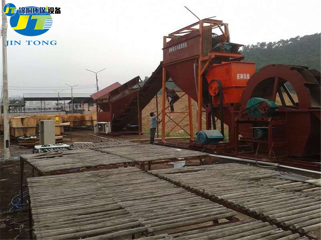 工程機械把毛料裝入料斗,經輸送帶進入篩分設備,幾支高壓水槍從不同角度同時沖擊篩分設備中的砂石,砂石在篩分的過程中,互相研磨,摩擦掉泥土和細小粉粒,泥土等細小顆粒因質量輕,隨水流走,砂石等較重物質經篩分,脫水設備脫水后有輸送帶送到指定位置后完成整個水洗分離過程。