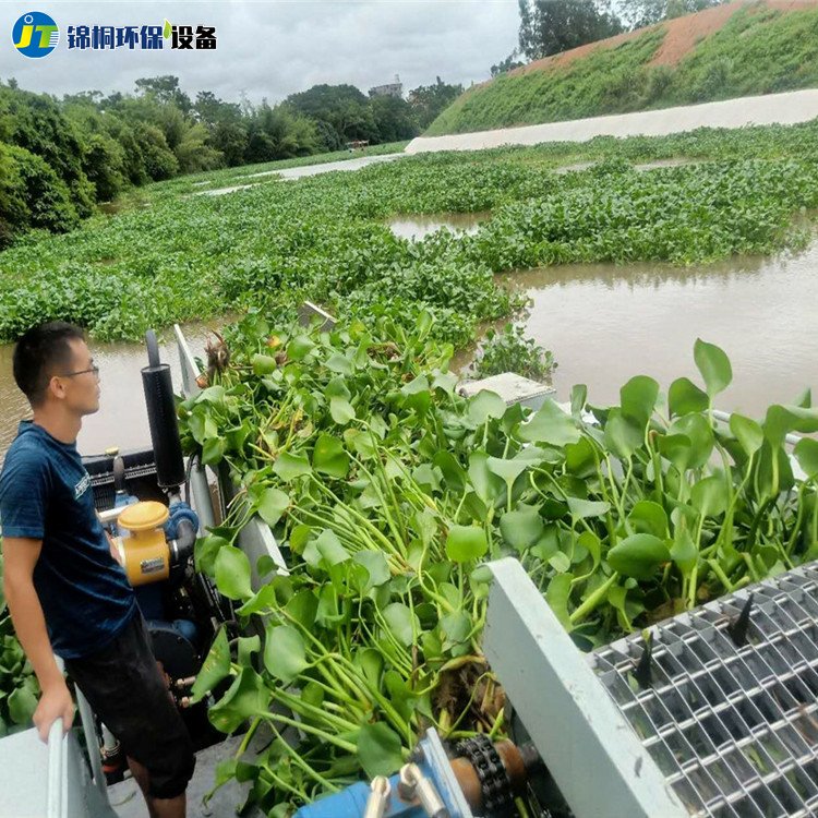 2.人工打撈水葫蘆費時費力,現在一般用機械產品清理水葫蘆,濰坊錦桐環保機械有限公司生產的割草船對于清理水葫蘆尤其好用,有全自動的也有半自動的,價格不一,半自動的需要人工卸料,需要三個人合作完成,全自動的實現了自動卸料,僅需一人即可操作。打撈起來的水葫蘆拿回家,曬干,用來儲存喂牛羊動物。