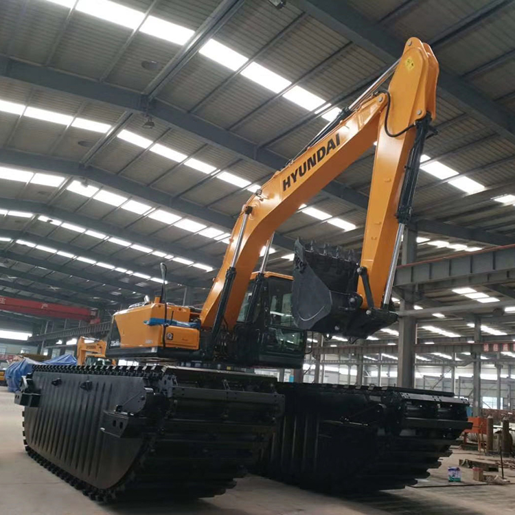 兩棲底盤(pán)通常采用履帶式行走裝置,履帶由高強(qiáng)度金屬材料制成,具有較大接地面積和良好抓地性能。部分車(chē)型(如兩棲挖掘機(jī))還配備浮箱結(jié)構(gòu),通過(guò)雙層密封空心浮筒設(shè)計(jì)增強(qiáng)浮力,確保水上穩(wěn)定性。2